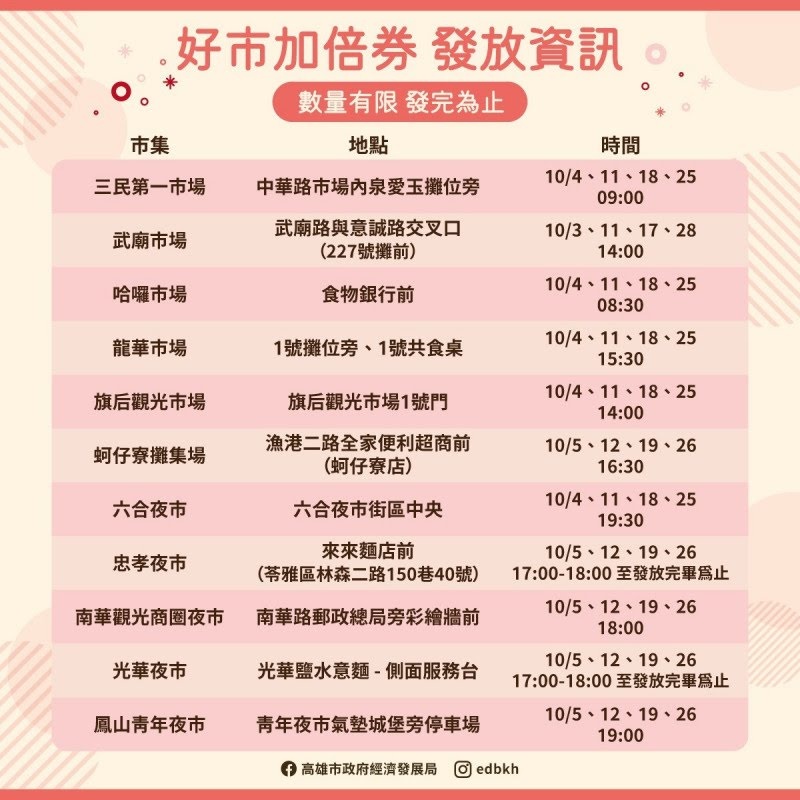 活動自10月3日開始持續4週,涵蓋高雄市內11處市場及夜市,包括龍華市場、三民第一市場