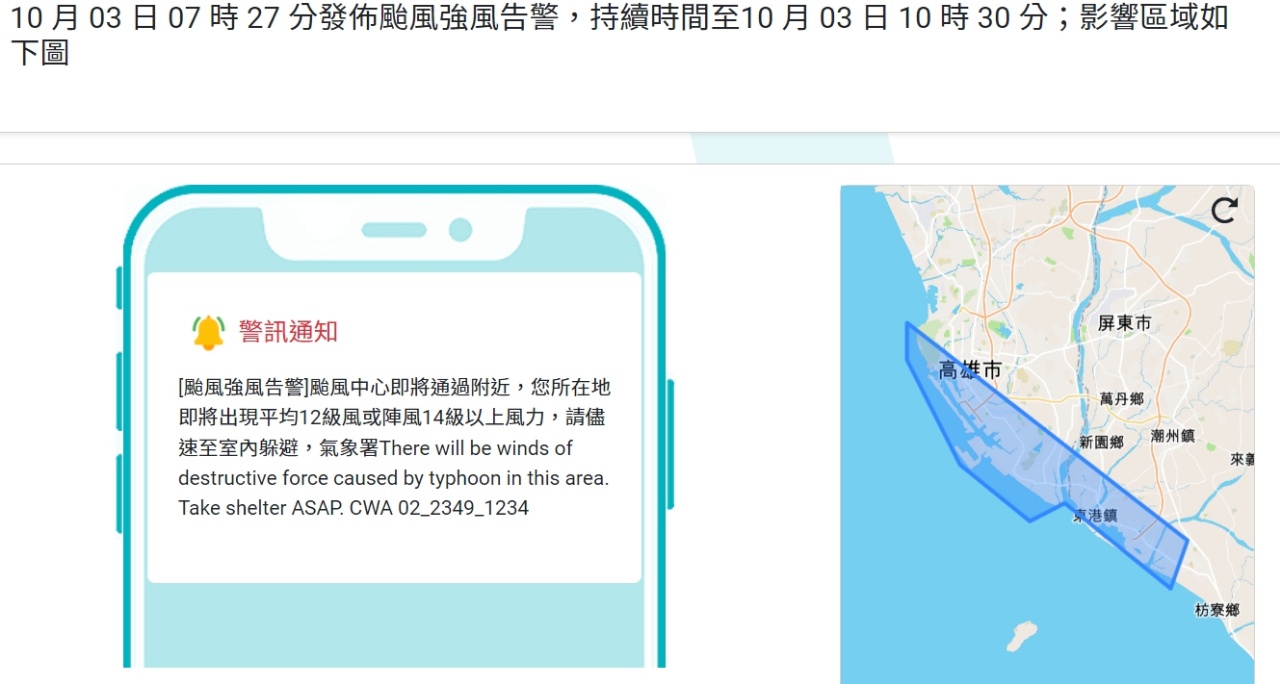 推 shuhong : 又收到一則,颱風中心即將在你所在區域登陸,瑟瑟 10/03 11:14