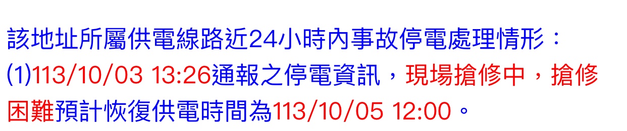 → fs1118 : 希望台電加油,林園目前還一大堆停電10/04 21:46
