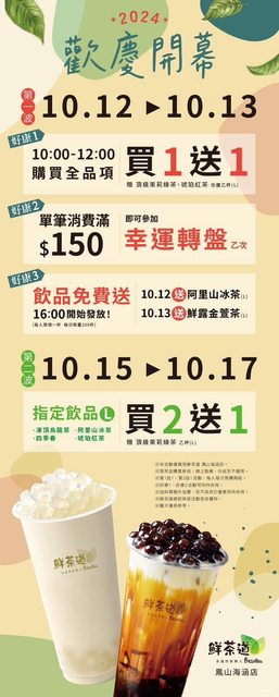 趕緊樓頂招樓下,阿母招阿爸,阿公招阿嬤,厝邊招隔壁,相揪來 「鮮茶道鳳山海涵店」吃吃喝喝,超多好康活動,還不快來嗎?