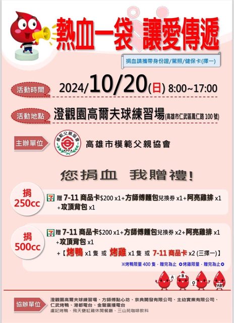 標題[閒聊] 10/20(六)捐血送仁武烤鴨一套