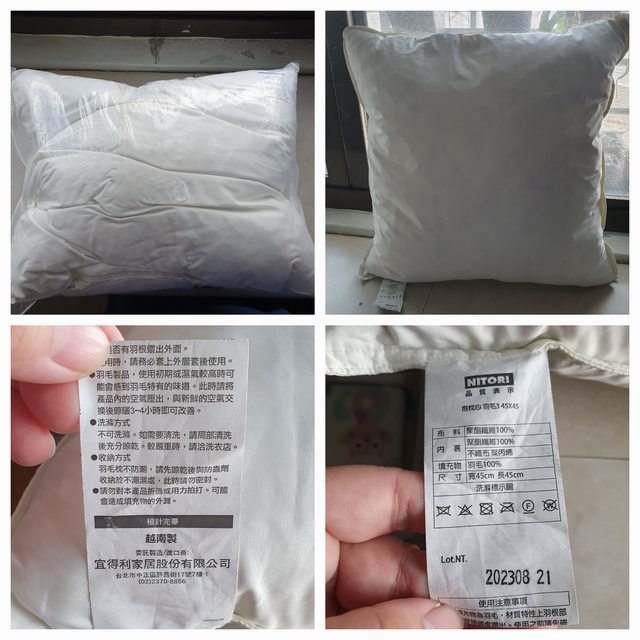 宜得利羽毛枕芯已拆封,套抱枕套試用後不習慣目前已用寢具保護套收存。