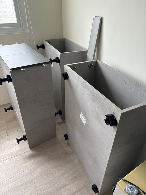 完好無損,門為對開的深灰色,三個櫃子都有腳可以疊起來也可以分開放