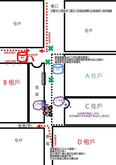 巷尾(之前租戶放門口的大黑垃圾袋有老鼠啃咬),