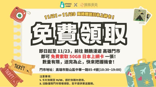 即日起至 11/23,前往 鵝鵝漫遊 高雄門市,即可免費索取 50GB 日本上網卡 !