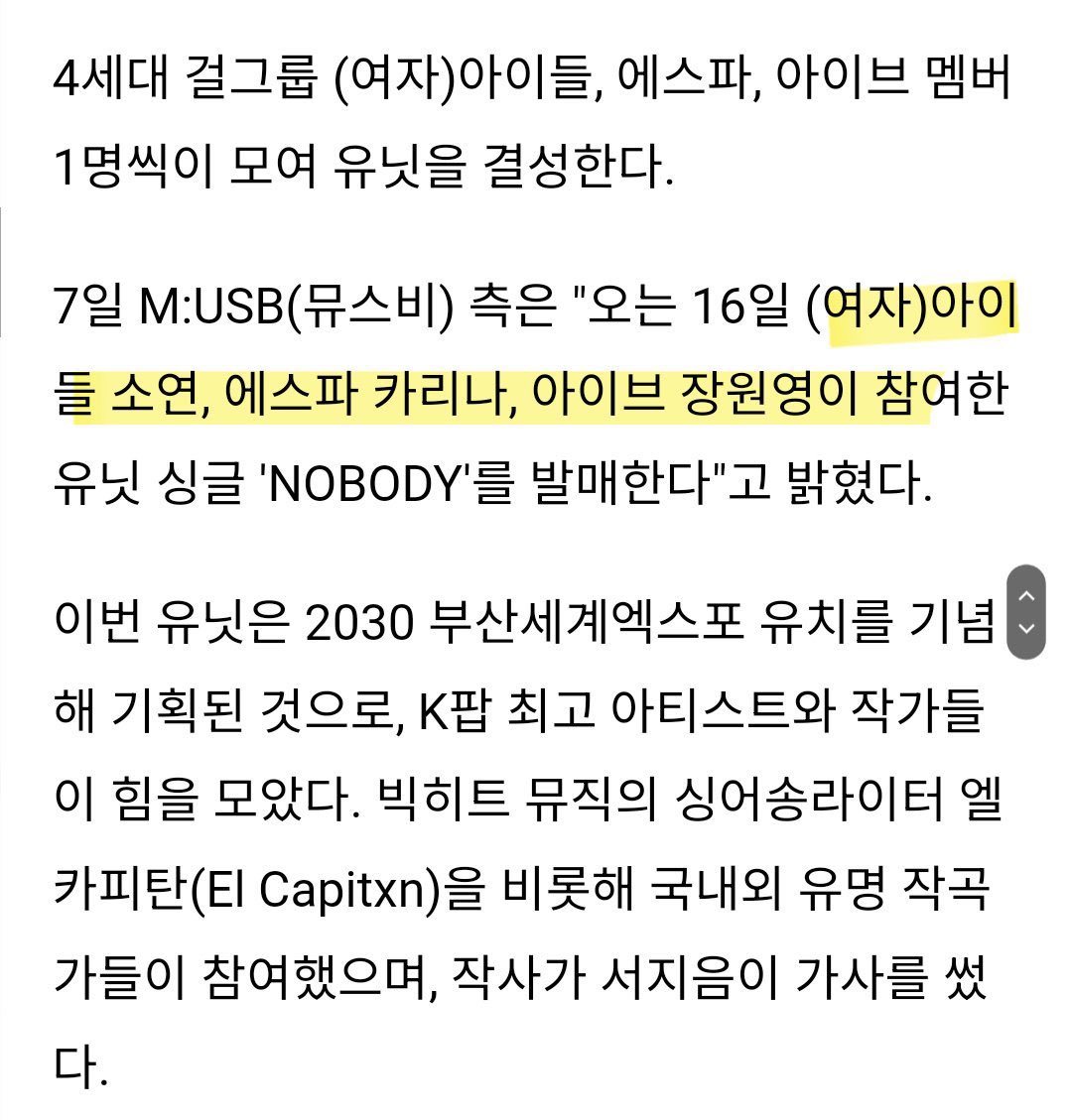 2023.11.16 6PM(韓國時間) 官方ig: https://instagram.com/m._.usb?igshid=MTNsNmRsbXEyNWF3Zg== 我改一下說法好了,意思有點不一樣 據說是三個團體各派一名成員,爭取2030主辦釜山世博會的合作曲。 推特來源(參考): https://x.com/YOONRAN5/status/1721396434929586345?s=20 然後我發現預告裡面打成(G)-IDLE.. ----- Sent from JPTT on my iPhone -- ※ 發信站: 批踢踢實業坊(www.ptt-web.org.tw), 來自: 111.71.49.51 (臺灣) ※ 文章網址: https://www.ptt-web.org.tw/KoreaStar/M.1699248683.A.315