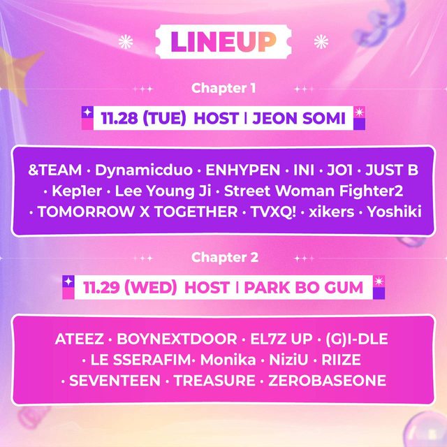 LINEUP Chapter 1 11.28 (TUE) 主持人:SOMI 全昭彌 &TEAM Dynamicduo ENHYPEN INI JO1 JUST B Kep1er 李泳知 Street Woman Fighter2 TOMORROW X TOGETHER TVXQ! xikers Yoshiki - Chapter 2 11.29 (WED) 主持人:朴寶劍 ATEEZ BOYNEXTDOOR EL7Z UP (G)I-DLE LE SSERAFIM Monika NiziU RIIZE SEVENTEEN TREASURE ZEROBASEONE - 頒獎人名單 #1bL3XhJH (KoreaStar) -- ※ 發信站: 批踢踢實業坊(www.ptt-web.org.tw), 來自: 110.28.9.183 (臺灣) ※ 文章網址: https://www.ptt-web.org.tw/KoreaStar/M.1700536606.A.AA1