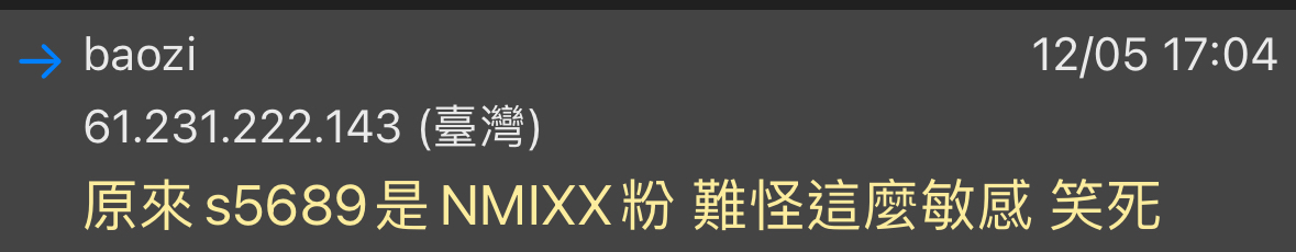 → baozi: 原來s5689是NMIXX粉 難怪這麼敏感 笑死 61.231.222.143 12/05 17:04
