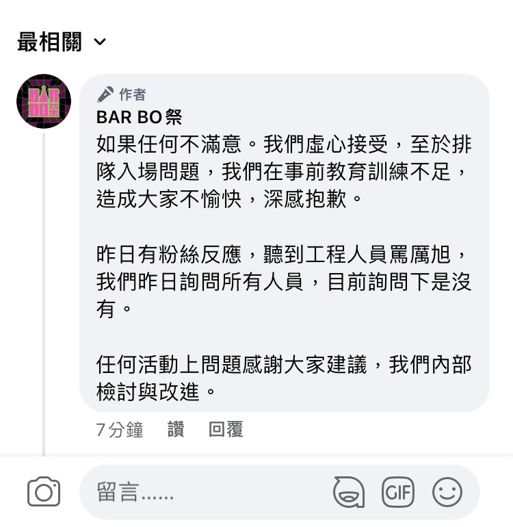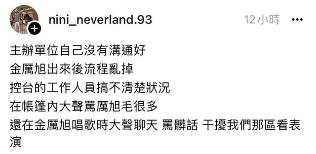 4. 現場整隊靠粉絲 工讀生一問三不知 場地規劃也亂七八糟 工讀生完全不知道要用什麼方式整隊 是粉絲自發用序號排隊 單人或雙人票完全不知道區域範圍 後來就是找能看到舞台的位置隨便站 5. 節目流程超亂 厲旭表演時間表訂1小時 約40分的時候 已經唱了10首歌 整個流程感覺就是唱完一首 我就播下一首 完全不管藝人在講話還是在喝水 唱完一首後 厲旭還在喝水 下一首歌的前奏就已經在播了 唱了30分鐘歌然後厲旭都還沒有做自我介紹 40分的時候主持突然上台說要倒數煙火秀 倒數完前面1分鐘只有大螢幕有煙火 6. 翻譯專業度不夠 翻譯很像不知道哪邊找來的工讀生 (我覺得專業度比演唱會的糟糕 不知道是太緊張還是怎麼了 翻譯內容太長的話前面直接沒翻或者是翻錯 雖然粉絲韓文不錯但不要亂來啊 然後前面20分鐘嗎 完全沒有翻譯 就是台上台下用韓文互動 (有粉絲表示前面是翻譯的麥克風沒有聲音導致 7. 工作人員素質不好 還在活動中抱怨藝人毛很多 整個流程亂七八糟 活動也亂七八糟 內部溝通感覺也亂七八糟 帳篷內的工作人員還在活動過程中大聲罵厲旭毛很多 https://i.imgur.com/UkjMzlM.jpg