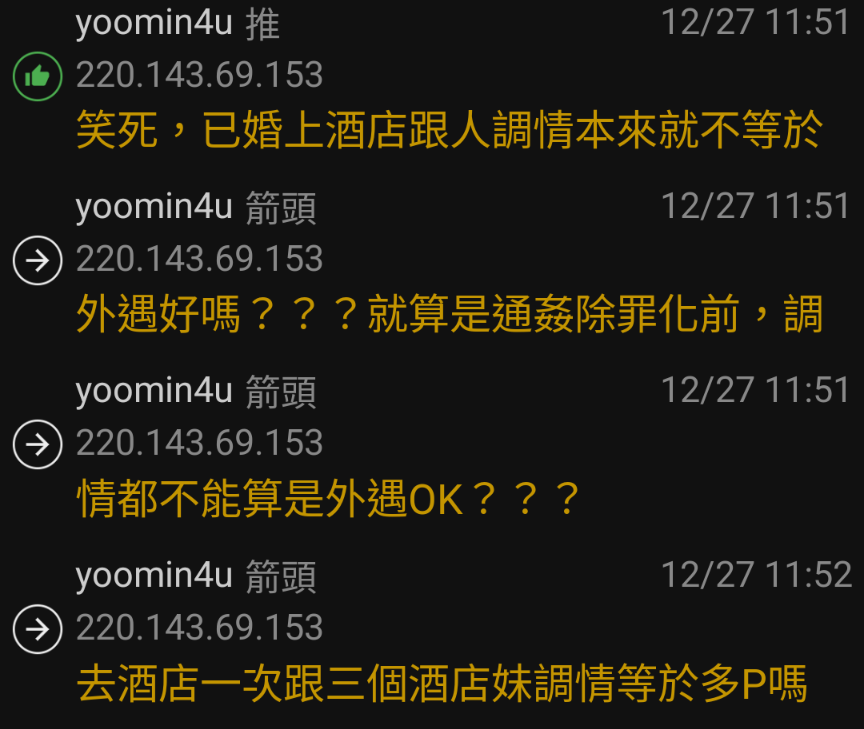 推 s860382: 不管怎樣如果是酒店外遇本來就屬於 60.251.69.80 12/28 15:41