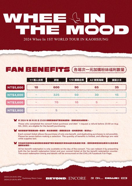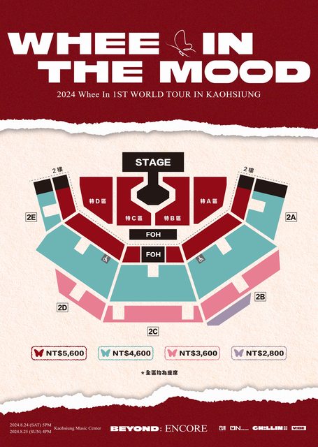 【2024 Whee In 1st WORLD TOUR: WHEE IN THE MOOD [BEYOND] ENCORE IN KAOHSIUNG】 加場確認 團寵輝人寵木木 高雄安可場確定加場! 雖然名為安可場 但彷彿是全新的演唱會 歡迎大家來見證巡完世界一圈的輝人成長後的樣子 《2024 Whee In 1ST WORLD TOUR: WHEE IN THE MOOD [BEYOND] ENCORE IN KAOHSIUNG》 活動時間 2024 年 8 月 24 日(六)5PM 2024 年 8 月 25 日(日)4PM 活動地點 | 高雄流行音樂中心 海音館 購票網站 | https://ibontw.com/CHILLINWHEEIN (實名制) 開賣時間 | 7 月 27 日(六)11AM(限網站購票,不開放機台) 票價|NT$5,600 / NT$4,600/ NT$3,600 / NT$2,800 粉絲福利加購時間|8 月 10 日(六)11AM(週六場次)/ 3PM(週日場次) 主辦單位 | 希林國際 Chillin International @chillin_international、VIBE MAKER 希波企劃 @vibemaker.tw https://www.instagram.com/p/C9wLCL9vJOs https://i.imgur.com/T8S7EL1.jpg