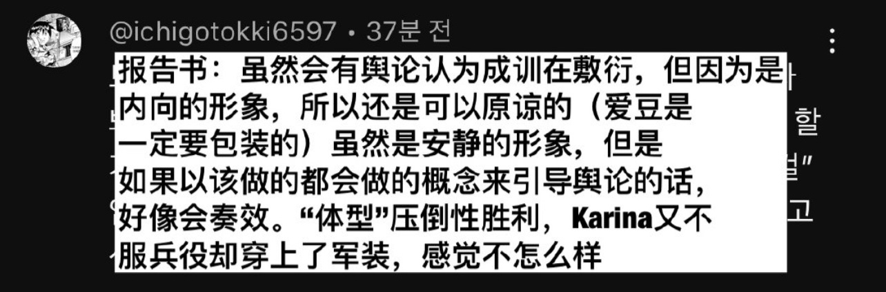 推 vernonsangel: Karina不服兵役那段超好笑 42.79.75.30 10/27 15:05