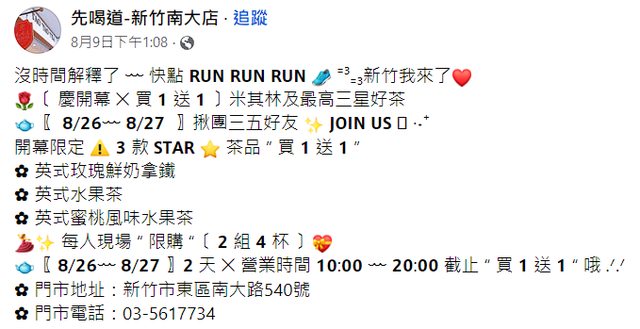 地點 : 新竹市東區南大路540號 時間 : 8/26~8/27,10:00~20:00 優惠 : 英式玫瑰鮮奶拿鐵、英式水果茶、英式蜜桃風味水果茶,三款茶品買一送一 理由 : 慶開幕 據稱是坐穩「貴婦手搖茶」封號的人氣品牌 https://i.imgur.com/u9QenU3.png