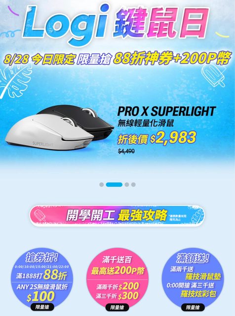 羅技指定鍵鼠滿2000折200、3000折300,指定時段有限量88折卷,再送P幣 我自己買了G502 Lightspeed 88折後2015+200P幣、送滑鼠墊跟很詭異的炫彩包,其他東 西不知道有沒有比較省,有興趣的大大可以去看看。 請注意!禁止發表有關[抽獎]、[紅利/推薦碼](含間接暗示等 ex:站內信)之文章/推文 情報文三十天內限發10篇!(自刪/被刪亦佔額度),亦禁止發推文代(合)購、徵求! -- ※ 發信站: 批踢踢實業坊(www.ptt-web.org.tw), 來自: 223.136.30.115 (臺灣) ※ 文章網址: https://www.ptt-web.org.tw/Lifeismoney/M.1693187292.A.2D5