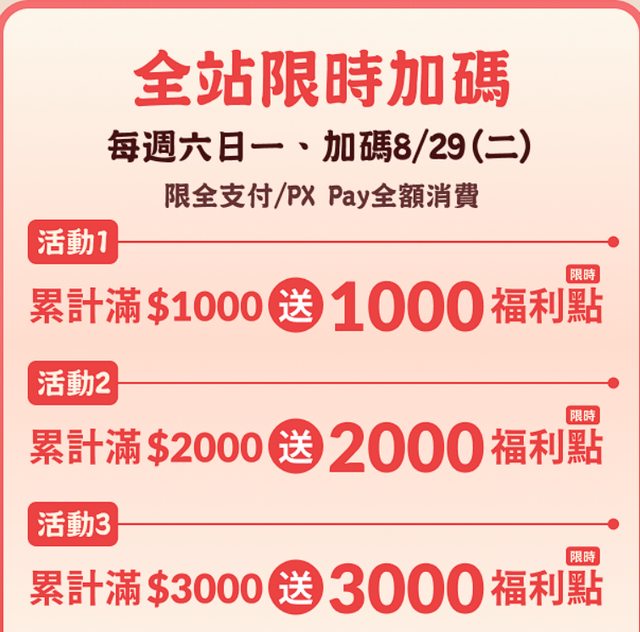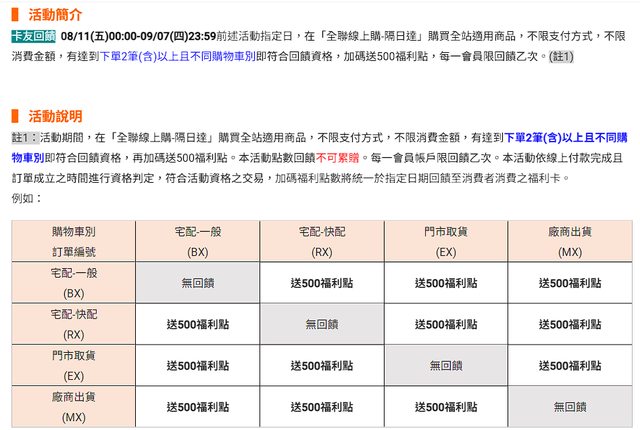 1.小時達,1500折335, 使用全支付/PXPAY付款再送800點限期福利點(等同於80元,得在9/30之前用完), 換算下來約73折 2.隔日達,首購族於每晚8點~12點期間可以觸發1000折200(其它時間只有折100), 等同於打8折,可以再湊200拿到滿千的1000點限期福利點,這樣就變成75折, 要注意的是隔日達有分成快配跟一般配,不能一起結,所以尾數不太好湊 https://i.imgur.com/mSqD3gt.png