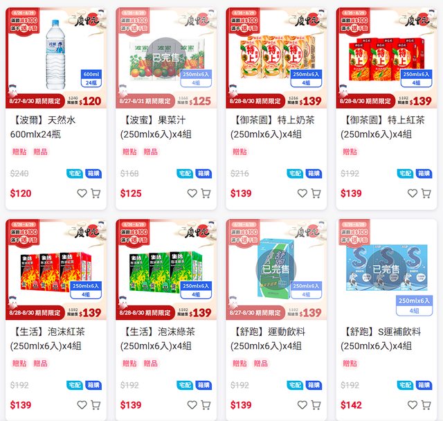 3.還是隔日達,下單2筆且不同購物車時,贈送500點福利點, 隔日達的快配免運是399元,箱購一般配則是無需運費,這裡有兩種操作 a.第一筆買的是一般配,那這裡買快配湊399元拿500點,87折 b.第一筆買的是快配,那這裡買便宜的箱購一般配,等同於打58折~69折 https://i.imgur.com/ktnpeAN.png 鋁箔包系列,價格120~160元不等,免運