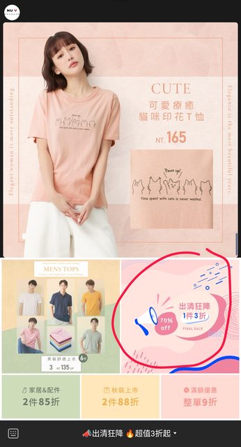 9/3更新 男裝三折也出現了 剛收到推播出清價三折 逛了一下幾乎都女裝三折 但其他男裝童裝價格也很便宜 有需要的可以參考看看囉 https://i.imgur.com/HYn7FJe.jpg