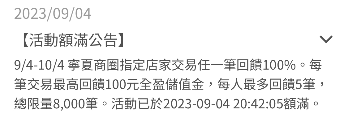 心得:很有誠意 https://event2023.pluspay.com.tw/Ningxia 2023/9/4-2023/10/4 跟著嘟嘟迺寧夏!消費回饋100% 1. 指定店家交易任一筆回饋100%。每筆交易最高回饋100元全盈儲值金,每人最多回饋5 筆,總限量8,000筆。 2.指定店家使用全盈+PAY累積消費滿168元,贈Fami!ce霜淇淋1支,總限量1,000支。 3.寧夏商圈指定旅電借電機台使用全盈+PAY支付租借行動電源,每筆租借交易之第一個小 時租借免費。 回饋時間 -全盈儲值金贈禮將於2023/10/31前入帳至符合回饋資格之全盈+PAY電支帳號。 -Fami!ce 霜淇淋將於2023/11/10前直接發送至符合活動資格之全盈+PAY會員之FamilyMart App「酷 碰券」內,使用期限至2024/1/10,實際依全網作業時間為準。 指定店家清單 蓮飲料吧 炒飯郎 你好!台灣地瓜球 魷皇駕到 大大燒烤 知高飯 愃享宴魯香飯 牛媽媽 深海郭魚湯 ㄚ米米熱狗 山東赤肉蒸餃 幸花明太子起司烤餅 饅喜歡你 火烤厚切牛排 芭樂王 寧夏阿諾可麗餅 鯊魚煙 Fun Sun G雞排 寧夏魷魚王 甲上糖炒栗子、仙草冰 阿卡拉炸雞 轟炸大魷魚 鴻記蔥餅捲 林振櫂燒麻糬 先來厚道章魚燒 老牌豬血湯 阿珍塩水雞 火爆骰子牛 寧夏牛排 李家鄉滷味 老六高粱香腸蛋餅捲 無骨雞腿排 邱記10元碳烤 黑輪 香腸炒米腸 豬肝榮仔 甜蜜紅茶 童年木瓜牛奶114 雅米花生捲冰淇淋 悅來甘蔗汁 詹記水果 福氣滿滿雞 寧夏碳烤塩酥雞 日船章魚小丸子 九龍城香港茶_寧夏夜市 炙燒骰子牛 頂級芭樂專門店 茶道樂 現打西瓜汁 古早味愛玉 宏玲精品娃娃 宏玲玩具百貨 德國豬腳 寧夏千歲宴 郭董藥燉排骨 蚵仔煎大王 牛五花 龍傳客家放山雞莊 環記麻油雞 曾家鮮果汁 甘記刨冰燒仙草 兩桶半米苔目 歐家果汁 馥陽鍋貼水餃 路攤壽司屋 里長伯麻辣臭豆腐 寧夏月氏 大鐤肉羹 武士食堂 歐帕醬醬雞 慈音古早味阿婆飯糰09 雞房重地脆皮鹽水雞寧夏店 冰霖古早味豆花 花枝燒 小唐大叔年糕魚蛋 最老牌苦茶 阿妹健康養生站 青蛙下蛋020 魏祥記麻糬冰 順記一品臭豆腐 鳥蛋達人 季哲廣東粥 黃金城&黃金薯 秋雲潤餅 王家生炒魷魚焿 菇之居 青蛙下蛋106 里長伯(攤) 阿妹海螺鳳爪120 月氏激蛋蔥油餅 放羊吃草新疆羊肉串 發發東山鴨頭 宏玲彈珠台 宏玲親子砲台 干單食堂 飄香牛肉麵館 典高戶外生活館_平陽店 西瓜芒果冰沙 旺來蛋糕 小春樓滷味食品有限公司 潮社冰品 好喝西瓜汁 收藏天地台灣文禮品館 好吃羊肉 四季青果汁 金大福草莓大福 越春珍越式料理 -- ※ 發信站: 批踢踢實業坊(www.ptt-web.org.tw), 來自: 1.200.6.73 (臺灣) ※ 文章網址: https://www.ptt-web.org.tw/Lifeismoney/M.1693545246.A.2FF