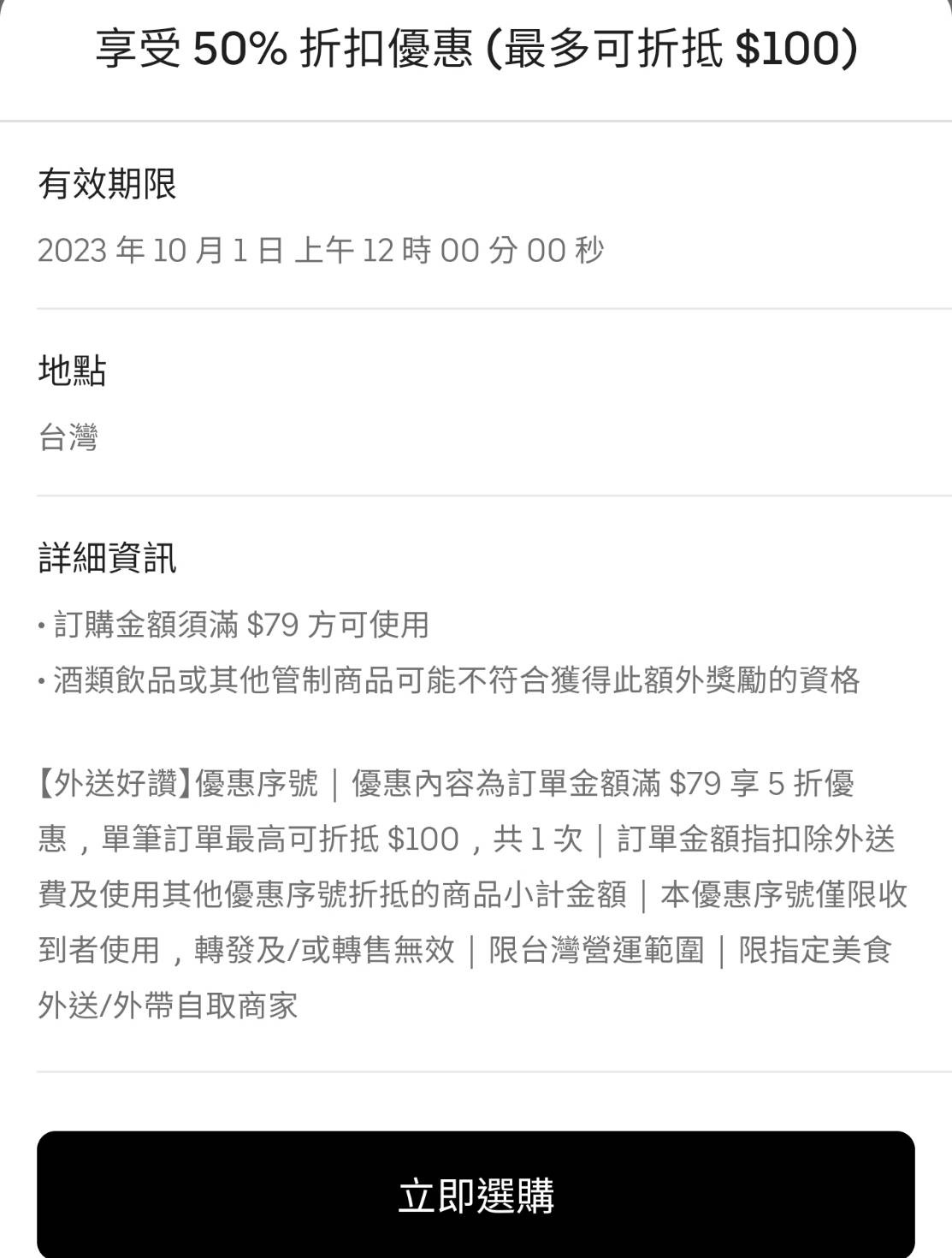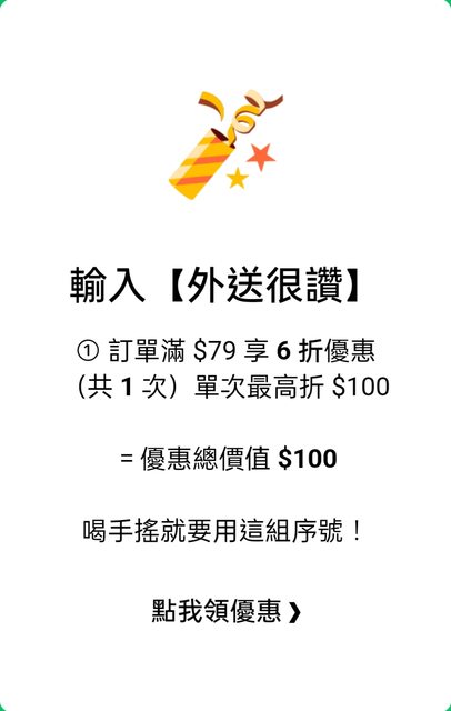 收到Ubereats的Mail 「很久沒叫外送了?送你驚喜優惠!」 09/30 前可輸入使用 優惠碼『外送很讚』 滿$79享6折優惠(共一次) 最高折100元 https://i.imgur.com/bzjsTmr.jpg