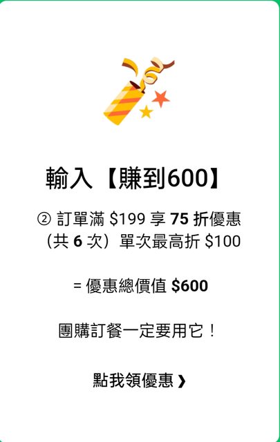 優惠碼『賺到600』 滿$199享75折優惠(共六次) 最高折100元 https://i.imgur.com/pIPo88S.jpg