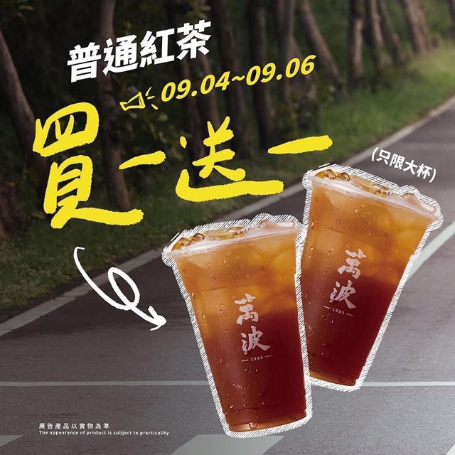 9/4(一)-9/6(三)限3天(活動已經延長至9/7) 購買「大杯普通紅茶」可享「買一送一」好康 注意: 1.飲料限當場一次領取,且不與其他優惠合併使用 2.僅供現場、來電自取和你訂自取,台南三井店與其餘購買管道不適用 3.萬波島嶼紅茶保留終止活動、贈品之權利,並保有此活動最終解釋權 https://i.imgur.com/7KNXSjI.jpg
