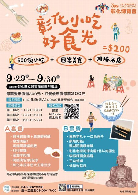 原文:https://reurl.cc/ed5Nam 彰化小吃好食光 敲碗很久的小吃饗宴終於要登場啦! 「套餐」形式,獨享小吃饗宴 網羅台灣版必比登 500碗殊榮 #彰化小吃 精選 A/B 兩種不同組合套餐供選擇 套餐從前菜、主食、副食、湯品、點心、甜點 #儀式感滿滿 (每份套餐只要 $ 200 元) 報名參加再贈活動聯名紀念品 http://i.imgur.com/YYEb2Li.jpg