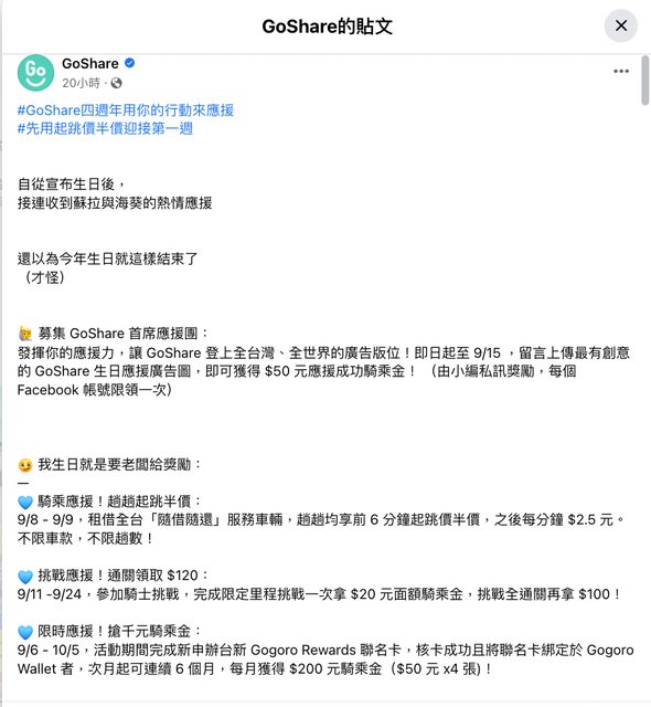 剛看到粉專po的四週年生日活動 明後天2天,趟趟起跳半價 不限次數 等於每趟可省個7.5-12.5左右 另外有一個應援團活動 把那個應援照合成上傳留言就可以拿$50騎乘金 有在騎的可以善用一下 -- ※ 發信站: 批踢踢實業坊(www.ptt-web.org.tw), 來自: 27.53.169.133 (臺灣) ※ 文章網址: https://www.ptt-web.org.tw/Lifeismoney/M.1694084119.A.760