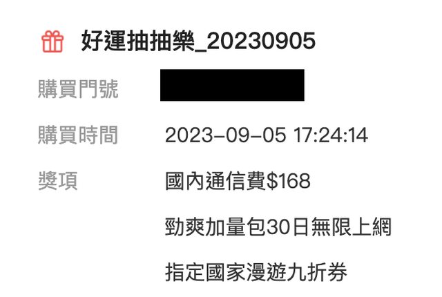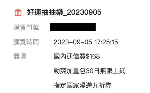 已經有板友分享資訊了! 但Reg大是用到新年的標題XD 我太晚才發現… https://www.ptt-web.org.tw/Lifeismoney/M.1693362221.A.436 分享一下我前幾天發薪水 單日十連抽的狀況 1. 10GB/Hami書城一個月 2. 8GB/漫遊九折券 3. 8GB/Hami書城一個月 4. 6GB/Hami市集百元折價券 5. 6GB/Hami書城一個月 6. 8GB/漫遊九折券 7. 30日無限上網/漫遊九折券 8. 8GB/Hami書城一個月 9. 6GB/Hami書城一個月 10. 30日無限上網/漫遊九折券 九月這檔中華的抽抽樂手氣不錯 十抽出了兩次30日網路吃到飽 https://i.imgur.com/astOYsR.jpg