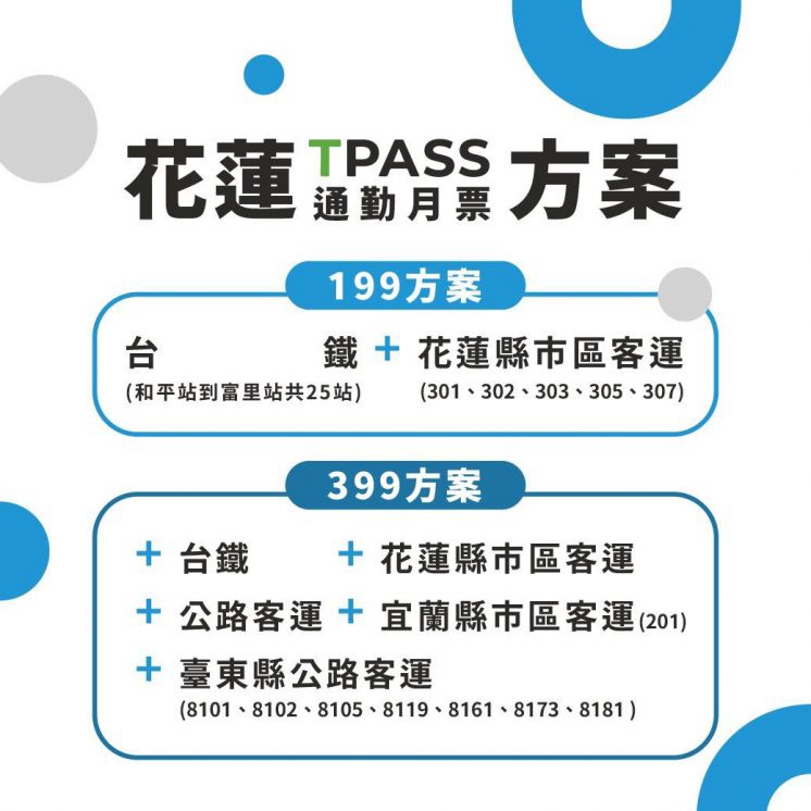 花蓮TPASS通勤月票最低價199元 10/2啟用 (中央社記者張祈花蓮縣8日電)花蓮縣府配合中央推動公共運輸通勤月票計畫,與台鐵、 客運業者合作,推出新台幣199元及399元月票方案,30天內無限次搭乘非對號列車、市區公 車及公路客運等,10月2日全面啟用。 花蓮縣府今天舉行花蓮TPASS行政院通勤月票發布活動,宣布即日起可於花蓮轉運站、四大 超商購買或預購票卡,10月2日正式啟用,民眾可依通勤需求購買合適方案,現場聚集不少 民眾詢問購票資訊。 花蓮轉運站營運商賴良賓接受媒體聯訪指出,2項方案都包含6條市區公車、台鐵非對號列車 可停靠富里站到和平站共25站,啟用後30天內無限次數搭乘。 賴良賓指出,399方案則增加公路客運、台東往返花蓮境內的7條城際路線等,不包含花蓮往 梨山的1141路線、羅東往返花蓮的葛瑪蘭客運及國光客運。 賴良賓表示,為鼓勵民眾多多利用公共運輸,除了公路總局補助款,加上地方自籌款挹注, 推出199元及399元方案價格,其中199方案是目前全台最優惠價格。 花蓮縣府建設處指出,位於花蓮火車站前的花蓮轉運站提供一站式服務,開放站內專屬服務 櫃台提供售卡及加值,可綁定月票儲值卡包含悠遊卡、一卡通、愛金卡等,或購買花蓮TPAS S紀念票卡。 花蓮縣府建設處指出,遊客可於花蓮通勤月票官網訂購花蓮TPASS紀念票卡,或至四大超商 預購,再前往花蓮轉運站儲值使用。 為協助校園學生了解月票政策,花蓮縣府將於全縣17所高中職、大學舉辦校園巡迴駐點購票 服務,提供現場申辦月票,還可獲得特製版愛金卡(icash)。 https://www.cna.com.tw/news/aloc/202309080198.aspx 感覺就算只是去花蓮玩兩天,買199好像也划算 不過花蓮的對號車不能搭...嗯嗯 -- ※ 發信站: 批踢踢實業坊(www.ptt-web.org.tw), 來自: 27.242.164.252 (臺灣) ※ 文章網址: https://www.ptt-web.org.tw/Lifeismoney/M.1694174888.A.F68
