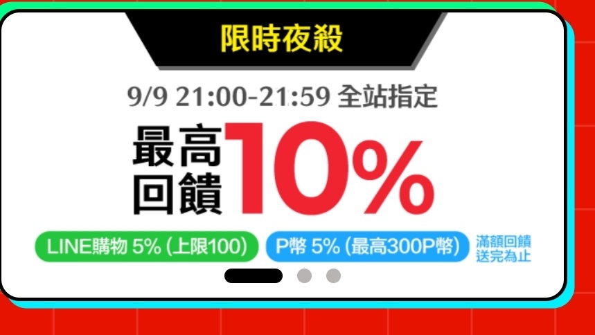 9/9 21:00 ~ 21:59 回饋 5%+5% 有需要可以看看 https://i.imgur.com/IXXpoAF.jpg