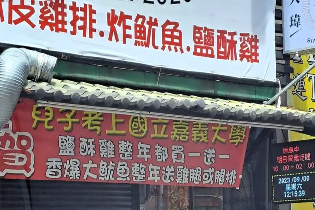 孩子永遠是父母的驕傲!8月大學放榜,高中畢業生將迎向大學新生活,有網友發現路邊 雞排店掛上大紅布條,大字寫下:「兒子考上國立嘉義大學,鹽酥雞整年都買一送一」, 短短3小時就超過5千人按讚,《NOWnews今日新聞》也找到霸氣闆娘,她樂不可支表示兒 子這兩天就要下南部,後(11)天正式開學成為大一新生! 網友在臉書社團「路上觀察學院」貼出一張照片,只見雞排店掛著大紅布條,店家為了慶 祝「兒子」考上嘉義大學,鹽酥雞整年都買一送一,香爆大魷魚整年送雞腿。霸氣大放送 立刻引起關注,眾人笑稱「兒子考上嘉大,應該整年都要免費加大」、「老闆買一送一整 年很慷慨」、「這根本我爸媽,當初考上宜蘭大學他們超開心」。 也有人質疑只是活動噱頭,或許老闆就是「兒子」本人。《NOWnews今日新聞》記者找到 該間門市,正是剛搬到桃園八德和平路的大瑋叔叔炸雞,接電話的張姓老闆娘難掩喜悅, 透露8月15日放榜當天,就開心到去找廠商做布條,兒子自己也頗意外可以考到嘉義大學 ,一家人都很開心,才想說好好慶祝。 布條掛上後,很多客人都好奇發問真的嗎?老闆娘也不厭其煩秀出錄取通知,逐一解釋給 客人聽,「真的太開心了!」網友擔心全年大放送會被吃垮,張姓老闆娘笑笑說,鹽酥雞 原本60元,買1送1不至於大賠本,但確實就沒利潤了,不過客人還會加點其他東西,「當 作交朋友、以雞會友啦!」 ===== 活動開整年超狂,但都買一送一了還只是沒利潤而已喔? -- https://i.imgur.com/dTf6rGu.jpg 月曜日