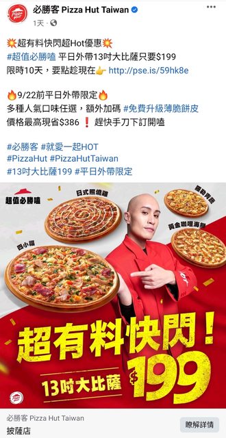 內文: 超有料快閃超Hot優惠 #超值必勝嗑 平日外帶13吋大比薩只要$199 限時10天,要點趁現在 http://pse.is/59hk8e 9/22前平日外帶限定 多種人氣口味任選,額外加碼 #免費升級薄脆餅皮 價格最高現省$386 趕快手刀下訂開嗑 #必勝客 #就愛一起HOT #PizzaHut #PizzaHutTaiwan #13吋大比薩199 #平日外帶限定 平日199又來了,想吃的可以先訂了 嫌料少的就自己略過吧 (隔這麼久都沒人發,只好自己發 -- ※ 發信站: 批踢踢實業坊(www.ptt-web.org.tw), 來自: 203.204.59.86 (臺灣) ※ 文章網址: https://www.ptt-web.org.tw/Lifeismoney/M.1694515364.A.31D