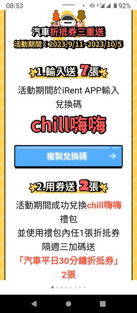 app輸入chill嗨嗨 就可以拿到7張平假日30分鐘的折價券 https://i.imgur.com/JXhot9P.jpg