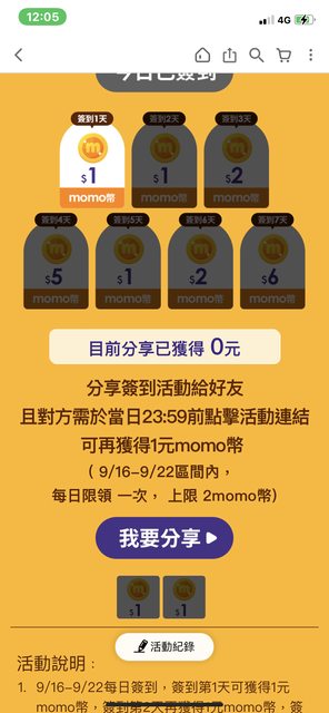 9/16-9/22簽到分享最高送$20momo幣 簽到18+2分享 momo幣將於簽到後立刻歸戶 使用期限至 9/22 23:59 https://i.imgur.com/tQH2dhI.png
