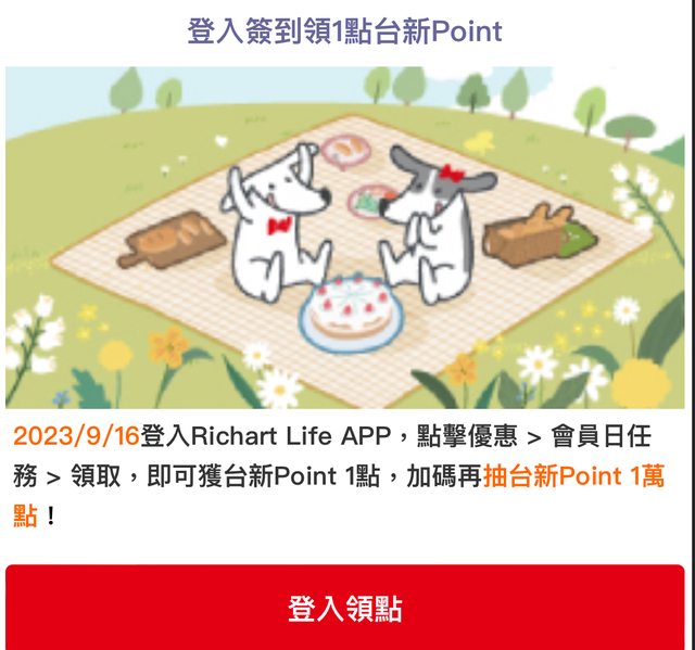 2023/9/16登入Richart Life APP,點擊優惠 > 會員日任務 > 領取,即可獲台新Point 1點 ,加碼再抽台新Point 1萬點! https://reurl.cc/edEADK https://i.imgur.com/DkR4Vwx.jpg