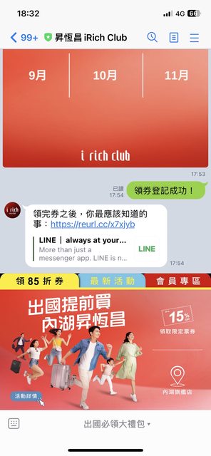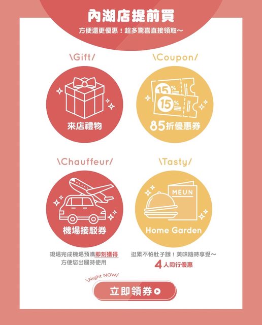 活動連結:https://bit.ly/3LpV19m 即日起至12/31止 到iRich LINE官方帳號出國領券區,即可獲得以下優惠券: - 出國來店禮兌換券:免消費,來店即贈! - 單品85折優惠券:可使用於免稅預購機場提貨商品 - 滿額(10,000)贈兌換券-餐盒餐袋組 - Home Garden餐飲折扣優惠券 - 市區接駁折價券$80:地點其一需指定內湖旗艦店使用 *出國前到內湖旗艦店現場完成免稅預購機場提貨交易 加碼送「機場接駁$200折價券」 https://i.imgur.com/Q6Trgzb.jpg