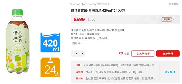 大家普渡零食櫃還是滿的嗎!(我們的都清好快 每年公司的普渡負責人都買好買滿 只要一到拜完的時候要分食各種零食都覺得有點罪惡 結果最近中秋還一堆禮盒 整個體重先上升3公斤(暈倒) 今年除了一如往常的可樂、乖乖、麥香 還多買了惜惜康普茶 (之前因為特價買的 喝了覺得可以在這種非常時期推薦給大家!!! 微氣泡感而且酸酸甜甜的 氣泡的也蠻解膩 而且喝完都會想上廁所 不知道是對的嗎XD 喝到現在其他瓶都瓜分給同事了 想說晚點自己再來買一些 剛剛看現在還在特價 分享給一樣喜歡康普茶的人參考 -- ※ 發信站: 批踢踢實業坊(www.ptt-web.org.tw), 來自: 42.73.94.143 (臺灣) ※ 文章網址: https://www.ptt-web.org.tw/Lifeismoney/M.1695026181.A.8F7