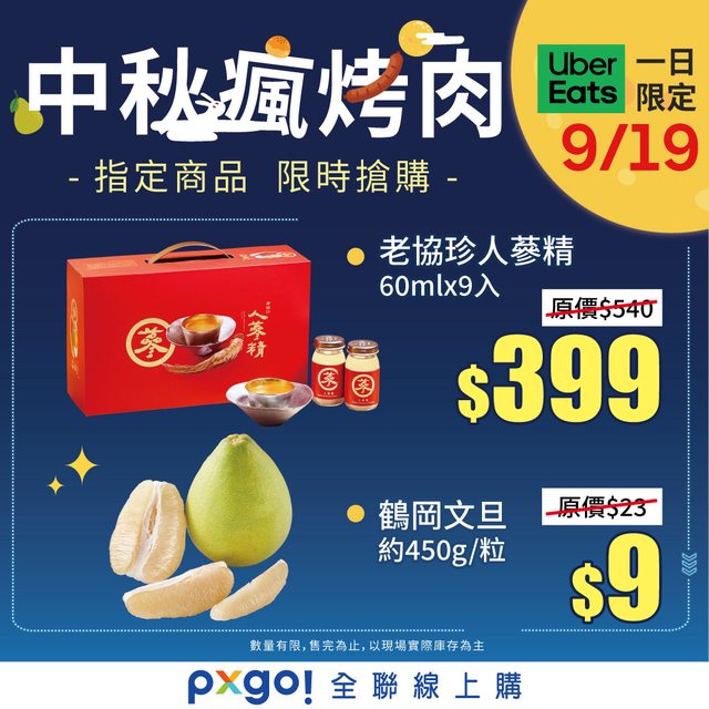 中秋瘋烤肉!全聯小時達! 單日限定!只有今天! 9/19一日限定最殺價,最低39折 鶴岡文旦 $9 老協珍人蔘精 $399 *活動詳情與售價請洽app或官網,以公告為準 *實際活動內容及服務範圍依App顯示為主 *優惠數量有限,售完為止 -- ※ 發信站: 批踢踢實業坊(www.ptt-web.org.tw), 來自: 220.130.178.240 (臺灣) ※ 文章網址: https://www.ptt-web.org.tw/Lifeismoney/M.1695108287.A.323