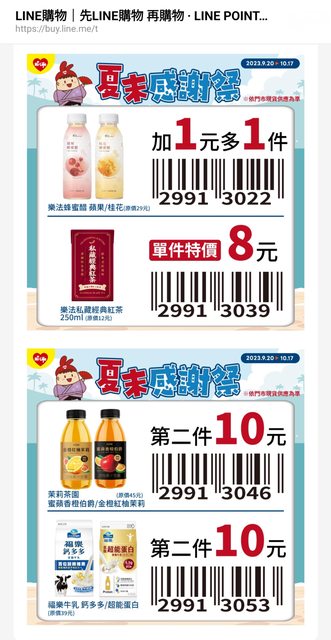 結帳時出示優惠碼供店員刷讀 即可享優惠價! 單筆消費滿200元(扣除菸品) 記得報會員掃導購賺 Line 點 https://tinyurl.com/hilifel 詳見左下【Ⓟ賺點攻略】 -- ※ 發信站: 批踢踢實業坊(www.ptt-web.org.tw), 來自: 1.162.37.252 (臺灣) ※ 文章網址: https://www.ptt-web.org.tw/Lifeismoney/M.1695148217.A.9F1