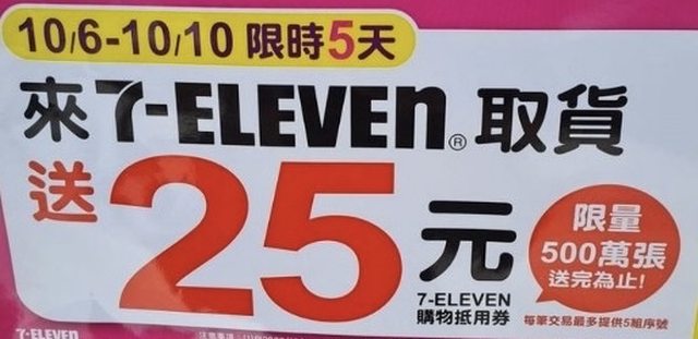 標題[情報] 10/6-10/10 7-11取貨贈25購物金 500萬份