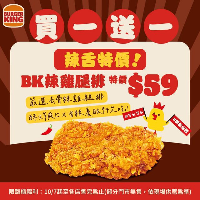 10/7 指定實體門市 BK辣雞腿排買一送一 59元 供應時間:2023/10/7起至各店售完為止 臨櫃福利說明:限臨櫃點餐適用(部分門市無售,依現場供應為準) http://i.imgur.com/flFj5kA.jpg