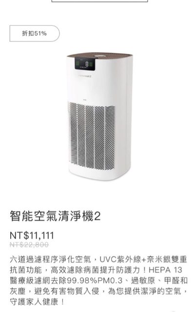 我自己打算入手智能空氣清淨機 11,111有便宜,而且這台也有H13等級HEPA濾網加上六道過濾系統 最近換季過敏又開始剛好要再多添購一台 https://i.imgur.com/RdUo32k.jpg