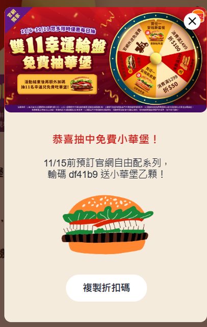 喜歡吃魚的就點鱈魚堡套餐, 味道比麥當勞的多變一點, 好不好吃看個人 講究蛋白質攝取CP值的, 可以選雙起士培根牛堡餐, 有27克蛋白質, 加送的小華堡有13克蛋白質, 至於附餐薯條或薯球的一丁點蛋白質就忽略不計了, 這樣99元套餐就可以攝取到40克左右的蛋白質, 算CP值很高了吧XD 然後兩個漢堡熱量490+300=790 , 還可以接受 至於轉盤的其他獎就CP值普普, 這邊列一下我轉到的 外送滿199免運 https://i.imgur.com/hJjLI8L.png