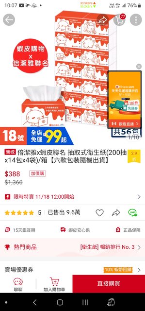 更新:金蝦與白金蝦會員限定 更新2:已搶完恢復原價 … 倍潔雅商城 非蝦皮超市 原價819的 http://i.imgur.com/PTGffLG.jpg