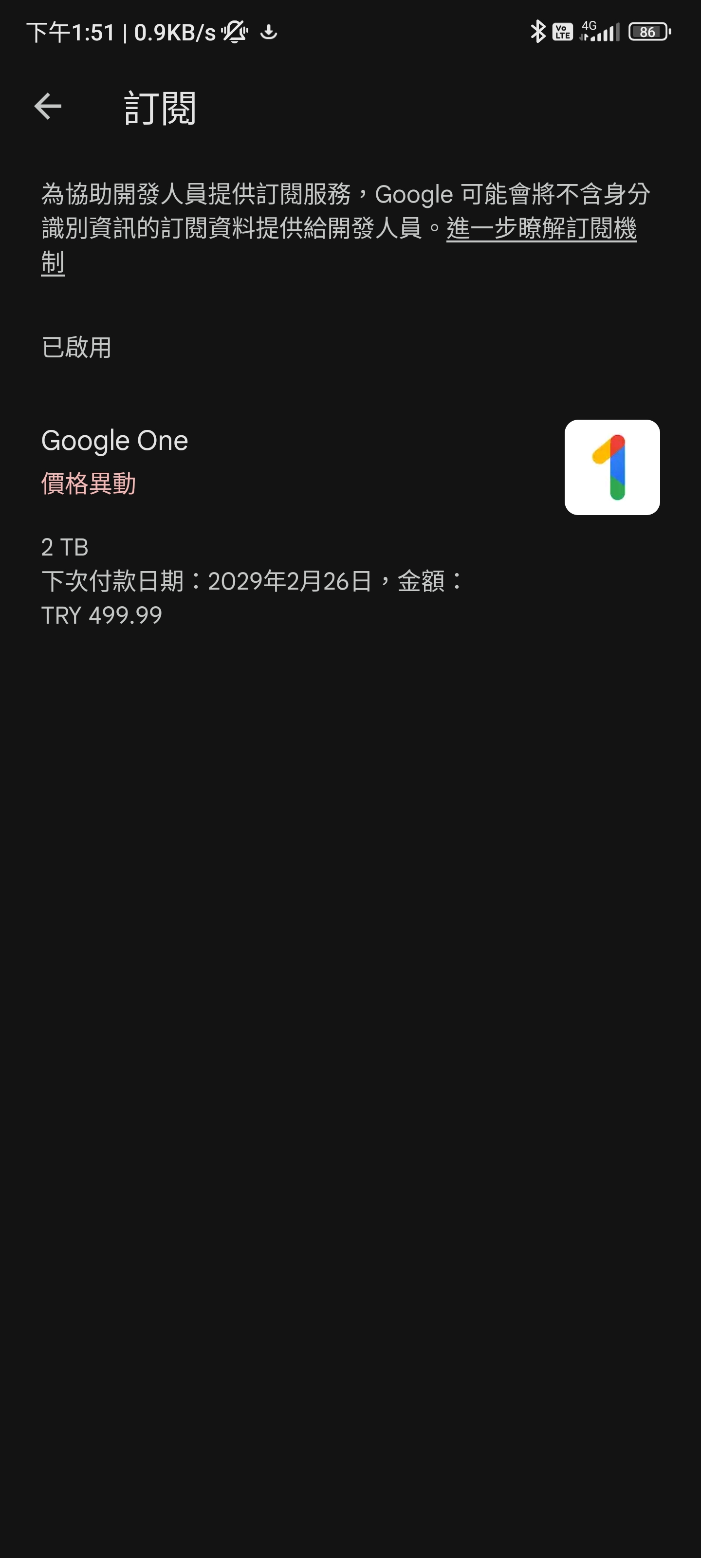 → oa0416: GOOGLE ONE也漲價了,上次看還是57.99里 223.141.25.154 11/19 10:19