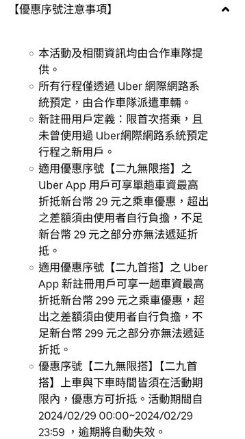 標題[情報] Uber 2/29 當日優惠無限次折29 首搭折229