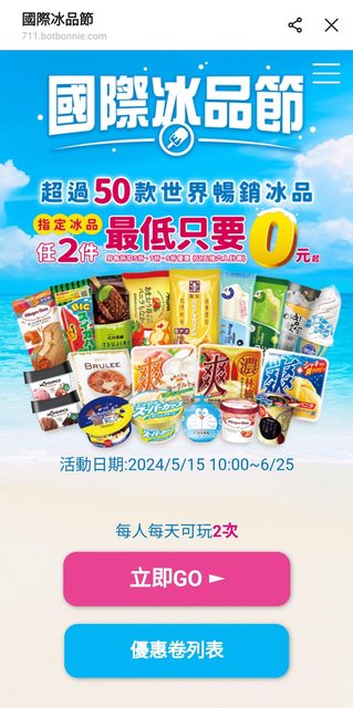 【活動名稱】:7-11 國際冰品節(冰品抽抽樂) https://liff.line.me/1632666493-LgbW567z/home?kitId=kit-HzGk99Y_o 【便利商店/廠商名稱】:7-11 【活動時間】:2024/5/15-2024/6/25 【活動內容】: 國際冰品節活動期間 https://i.imgur.com/4au8yrZ.jpeg