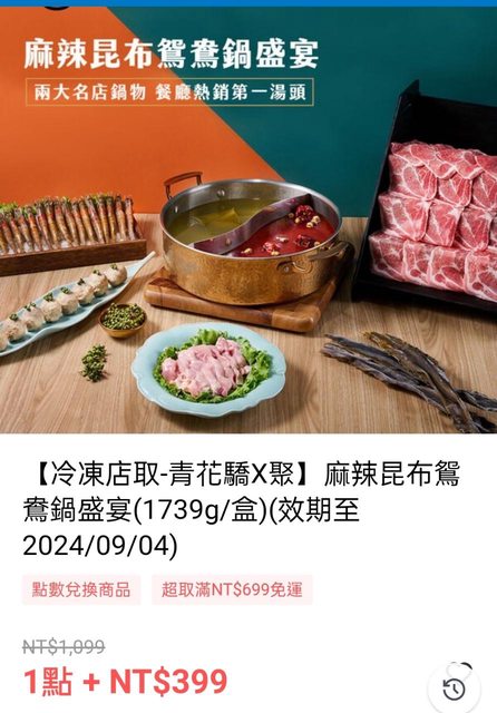 在實體店用餐覺得湯頭還不錯,這次即期品有兩種鴛鴦鍋組可選擇,價格399應該很划算 ,滿699免運 https://mart.family.com.tw/SalePage/Index/9672059 https://i.imgur.com/MyybDzz.jpeg