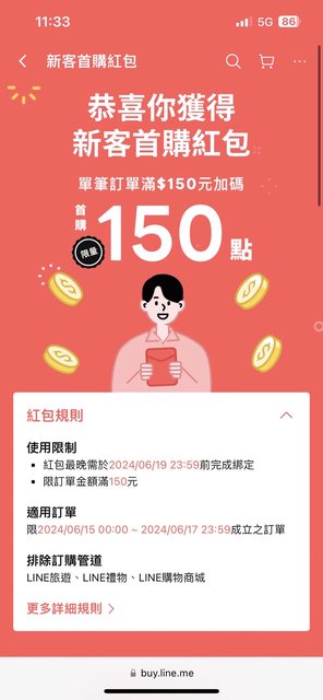另外隨手測了一下,這個紅包看起來是新客進到LINE購物會主動跳出來,但已經買過了就什