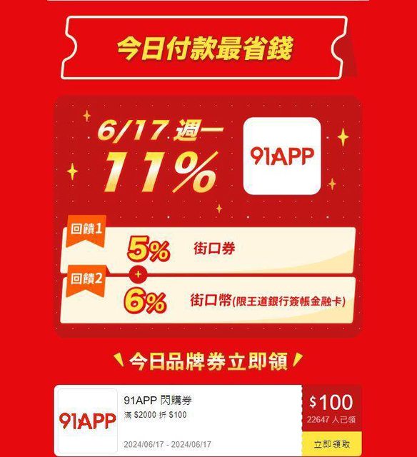※ 引述《taylor471961 (快樂結局)》之銘言: : 如題 : 今天6/17暖場 : 閃購券2000折100 (5%) : 搭配王道銀行的卡(6%) : http://i.imgur.com/89DrUkl.jpg